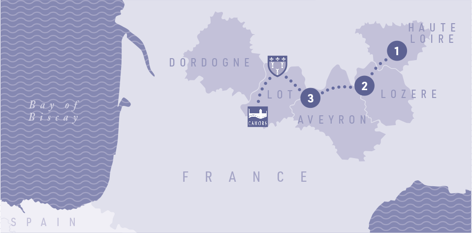 Stretching almost 750 kilometers from the dramatic volcanic city of Le Puy-en-Velay to the gateway of Spain, the route cuts directly through the Massif Central. Along the way, it leads pilgrims across incredible and dramatic terrain, from the volcanic formations of the Velay, climbing through the windswept highlands of the Margeride, and later crossing the stark, open expanses of the Aubrac plateau. The trail then descends into the beautiful valleys of the Lot and continues over the dry limestone plateaus of the Causses du Quercy before easing into the softer farmland of Gascony.