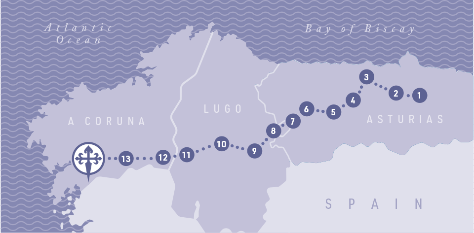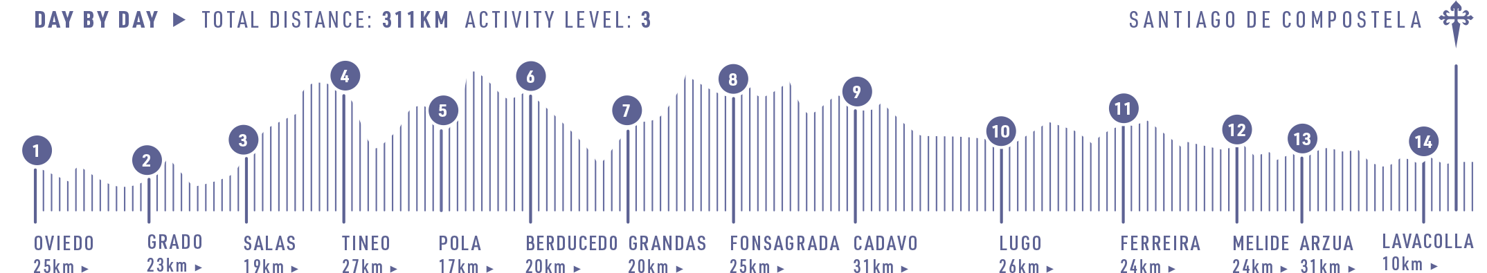This route is one of the oldest Camino routes and is also one of the most challenging. Most of the route is on well marked rural paths. The route heads inland and is known for it's mountainous terrain through Galicia and Asturias, reaching heights of above 1, 000m.