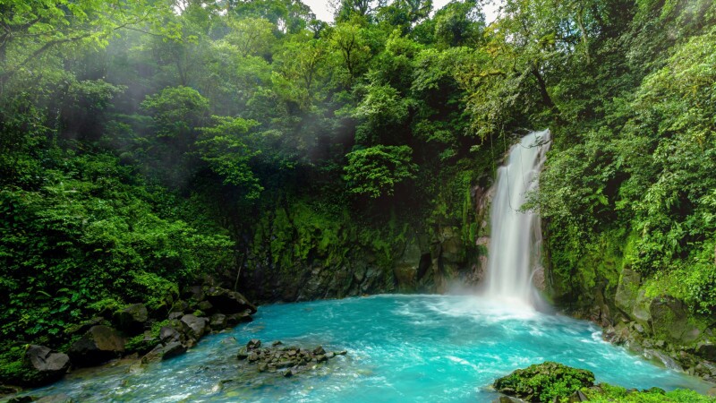 • Marvel at the sky blue water and magnificent waterfall at Rio Celeste