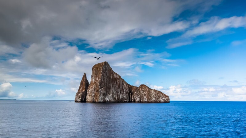 Kicker Rock is an awe inspiring natural formation off the northeast coast of San Cristobal Island which rises dramatically from the ocean. Viewed from the side, it resembles a giant upside down shoe with a towering heel, giving it the name Kicker Rock, while its longitudinal profile evokes a sleeping lion.